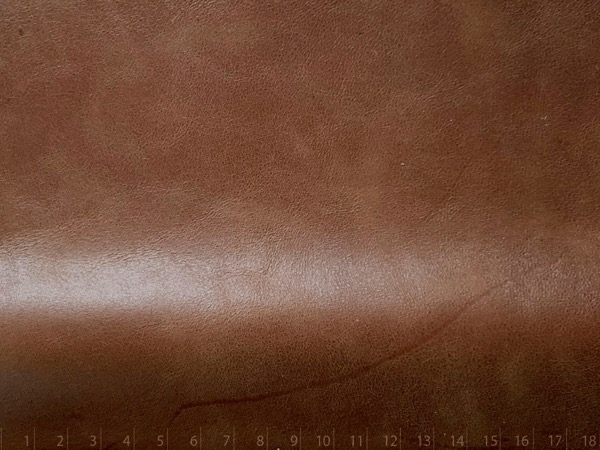 Cuero pulido, terminado con ceras y acrilicos. Semi brillo. De tacto suave. Efecto bitono y quiebre irregular muy atractivo.