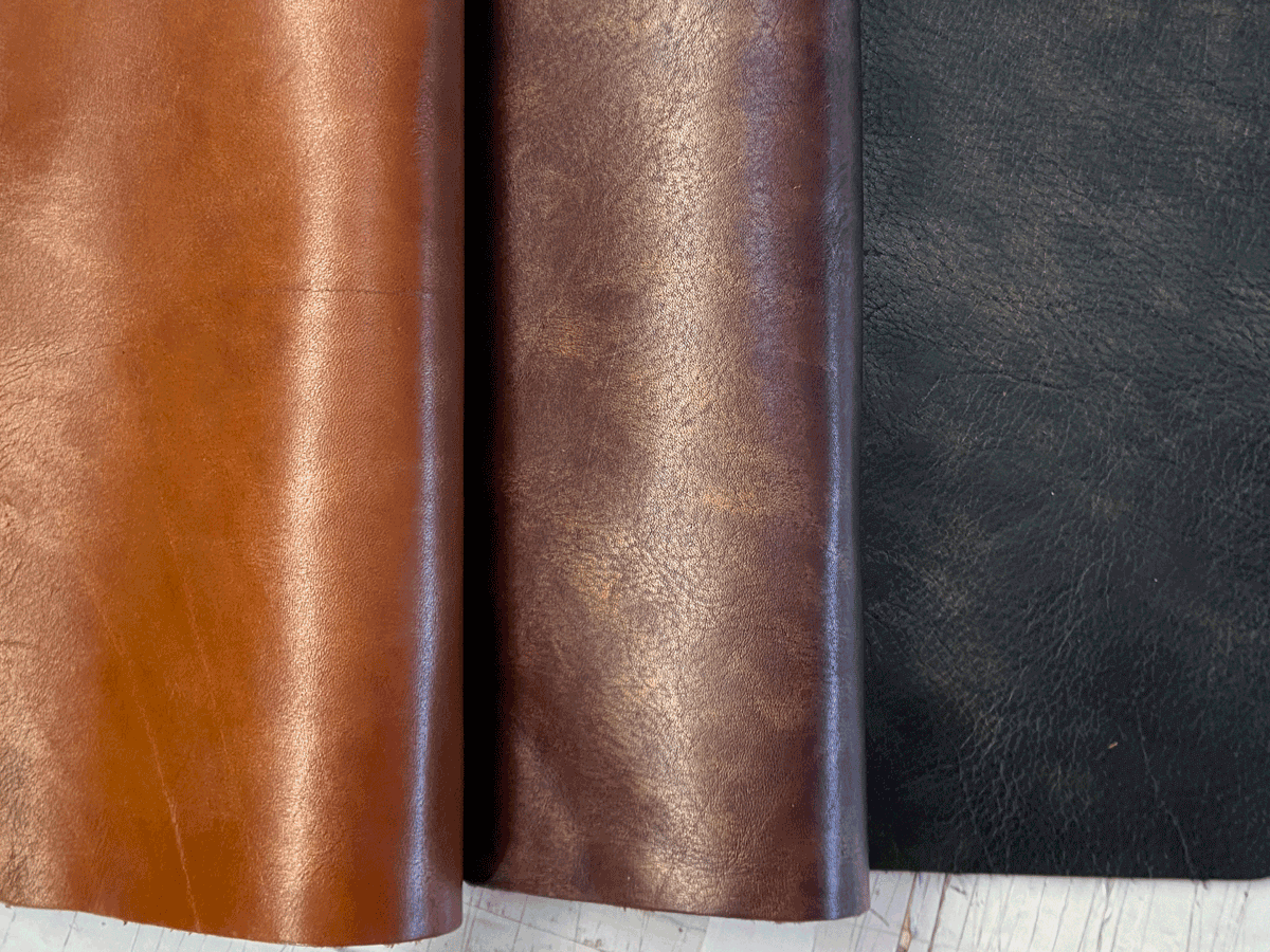 Piel plena flor, manchado de fulón, anilina, con un atractivo quiebre producto de la doble fase, con una suave mancha nacarada, brillo medio.