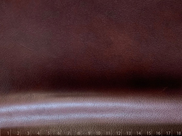 Cuero plena flor, manchado de fulón, anilina, con un atractivo quiebre producto de la doble fase, brillo medio.