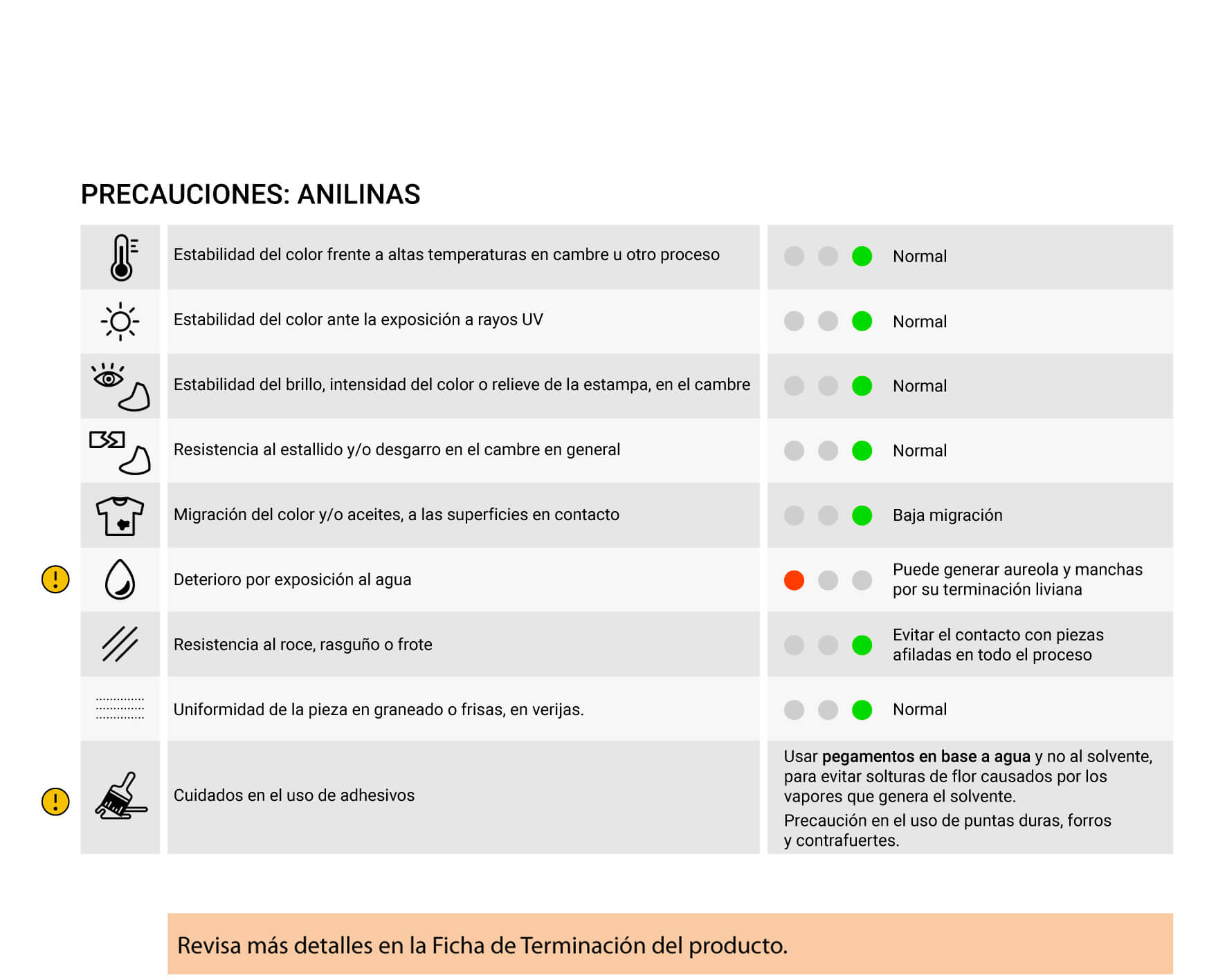 La firmeza del color varia entre los colores y entre los distintos artículos terminados. Es prioridad realizar una prueba del nivel de firmeza del color sobre el cuero que se va a usar con la finalidad de asegurarse que el cuero seleccionado es el adecuado para ese uso especifico. CONAC SA no acepta ni se hace responsable por ninguna transferencia o migración de color sobre cualquier otro material. Si existen dudas, se recomienda solicitar una muestra